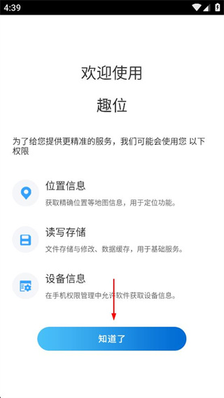 2、进入趣位的权限说明页面,查看位置信息读写存储设备信息等权限说明,找到知道了按钮。