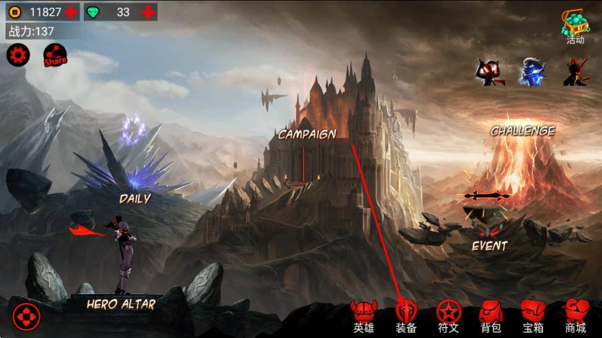 1、在火柴人联盟主界面,点击底部的装备,进入装备相关页面。