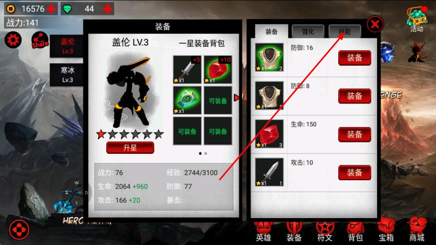 2、进入装备页面后,切换到技能标签页,进入技能管理界面。
