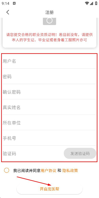 3、在注册账号页面填写信息后,点击开启宠医帮完成注册操作。