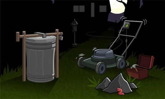 场景1:打开木箱,取出铁锤,敲掉垃圾桶左端的木桩,点击垃圾桶,让臭鼬撞到垃圾桶,拔掉电灯底座的插头,将插头连接在除草机上,此时点击绿色按钮,除草剂发出噪音吓走臭鼬,点击垃圾让异形虫进入垃圾,关掉除草机,臭鼬返回吃垃圾,死亡;