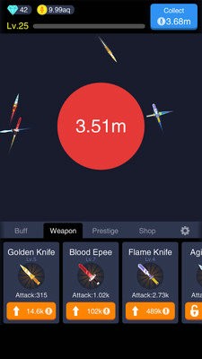 这是一款十分有趣的休闲放置手游,点击升级飞刀或者购买新的飞刀,飞刀会不停地滑动,你要引导它们攻击屏幕里的小球。